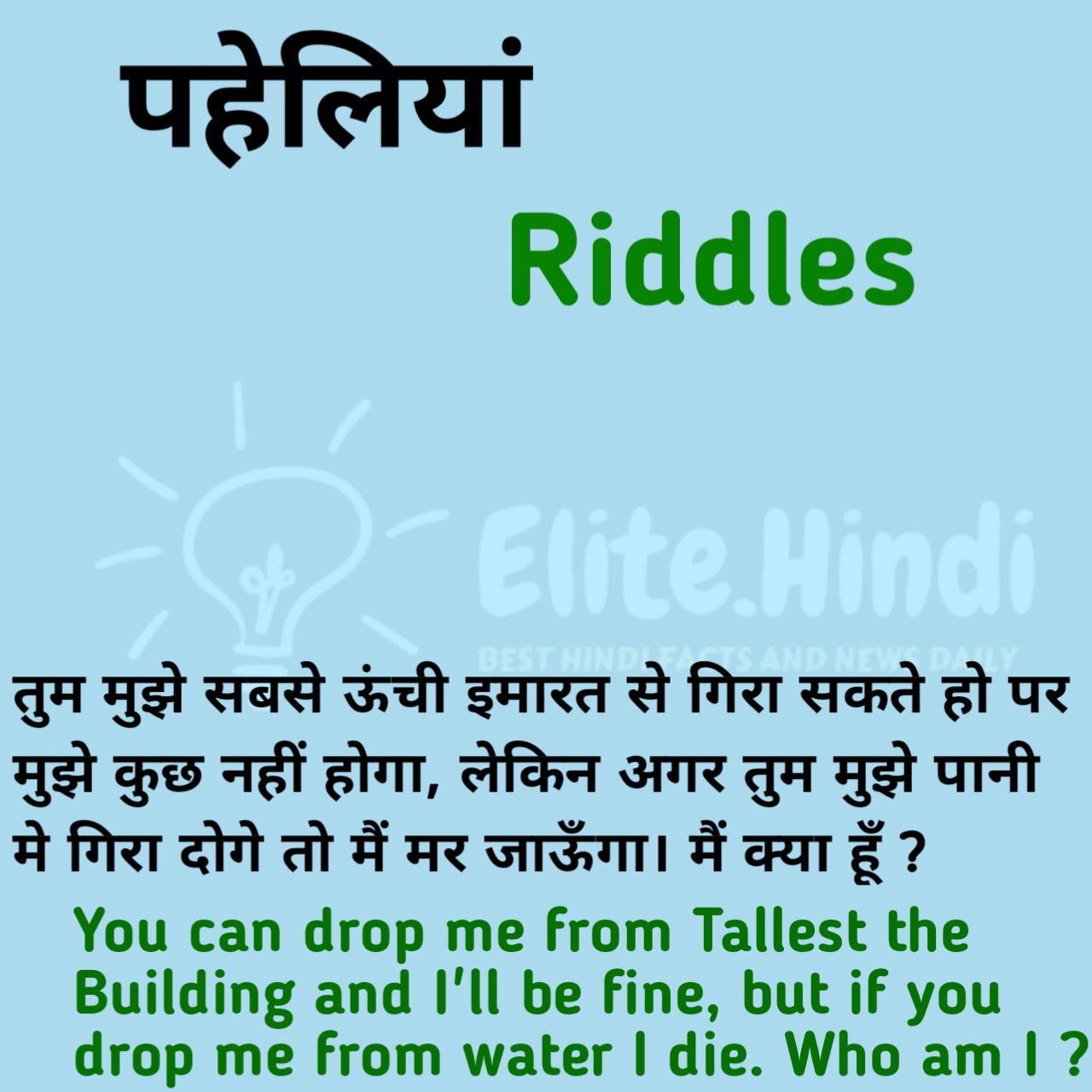 20. तुम मुझे सबसे ऊंची इमारत से गिरा सकते हो पर मुझे कुछ नहीं होगा, लेकिन अगर तुम मुझे पानी मे गिरा दोगे तो मैं मर जाऊँगा। मैं क्या हूँ ?